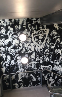 The giant 4 storey mural was conceptualised and illustrated by artist Liam Downes. Stretching across multiple floors, the expressive crowd members begin life at the foyer entrance and work their way up to the top floor; the gateway to the Park Life Gallery.